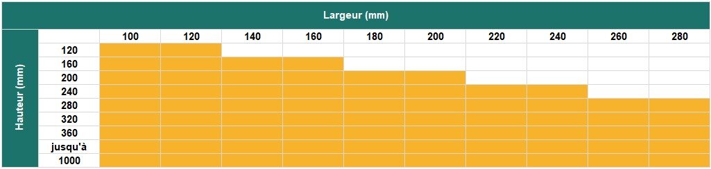Nous proposons, sur commande, un large choix de sections en épicéa que vous trouverez dans le tableau suivant (cases jaunes) :